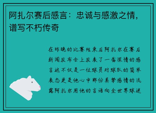 在昨晚的比赛结束后,阿扎尔在赛后新闻发布会上发表了一番深情的感言。这不仅是一位球员对球队的简单表态,更是他心中那份真挚感情的流露。阿扎尔用他的言语,向全世界球迷传达了他对球队的无限忠诚与深深的感激之情。德赢vwin158 阿扎尔在谈到这场比赛时,首先对球队的整体表现给予了高度评价。他提到:“今晚的比赛...