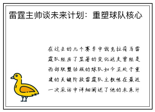 在过去的几个赛季中,俄克拉荷马雷霆队经历了显著的变化。这支曾经是西部联盟劲旅的球队,如今正处于重建的关键阶段。雷霆队主教练在最近一次采访中,详细阐述了他的未来计划,尤其是关于如何重塑球队核心的策略。这位经验丰富的教练表示,他不仅仅关注于球队的短期胜利,更致力于长期成功的积累,这需要通过培养年轻球员,制定合适的战术,并重建球队文化来实现。 雷霆队主帅强调,重塑球队核心需要一个明确的篮球哲学。他指出,...